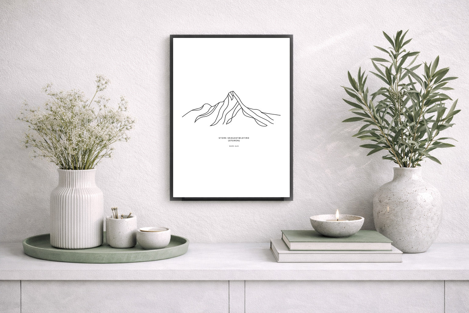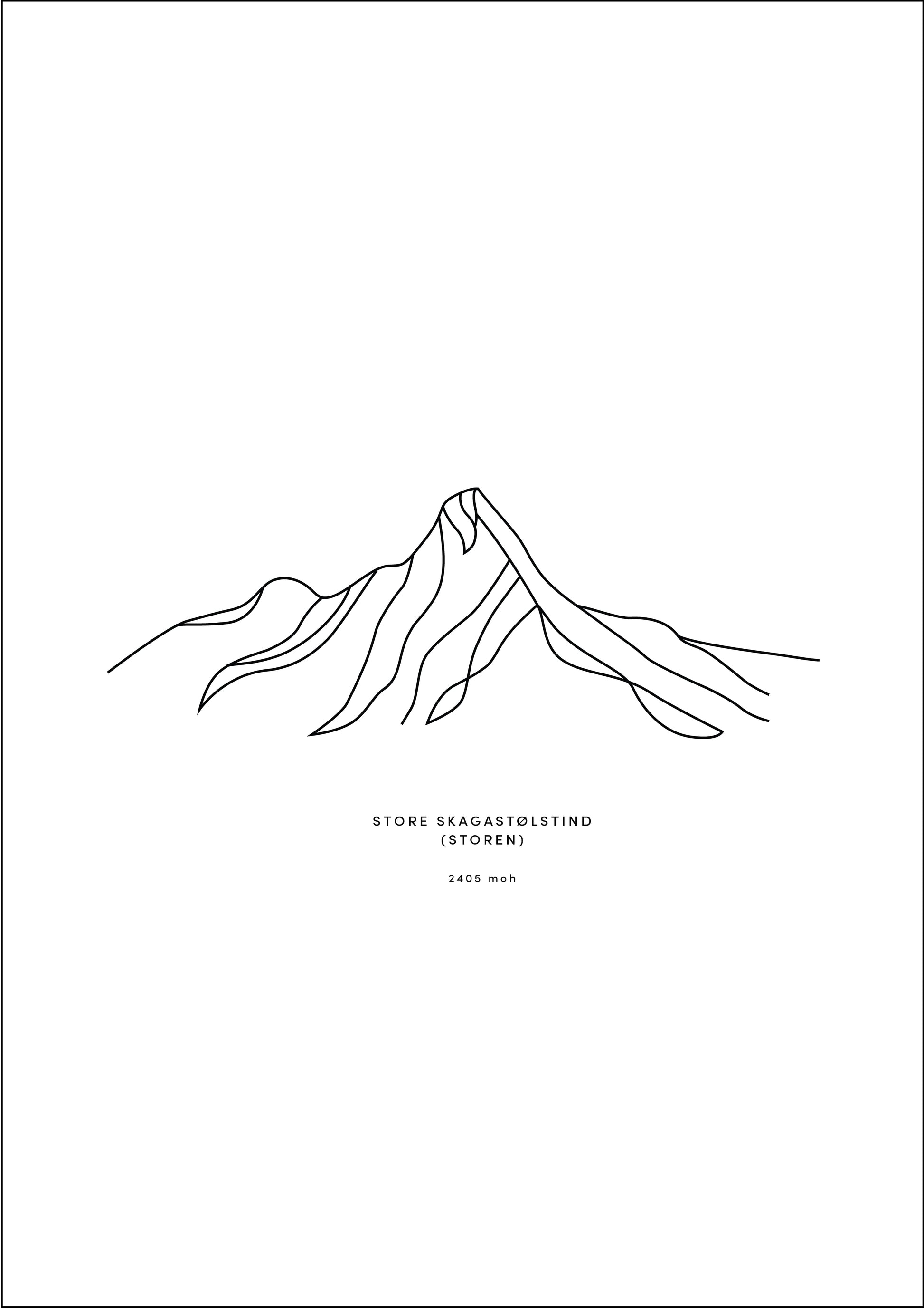 Minimalistisk kunstplakat av Store Skagastølstind (2405 moh), tegnet i et stilrent og nordisk uttrykk. Dette er en digital plakat du printer selv.